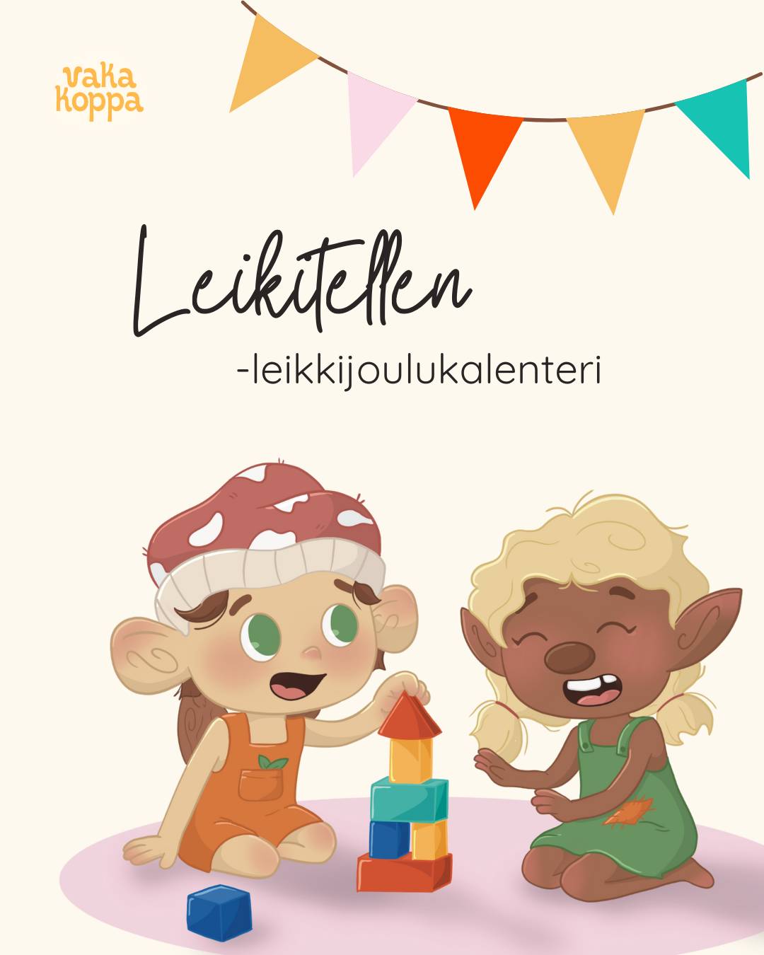 Leikitellen -leikkijoulukalenteri sisältää 24 erilaista vuorovaikutus-, mielikuvitus-, liikunta- ja hoksaamisleikkiä. Onpa joukossa pari riehumisleikkiäkin sekä leikillisyyden lisäämistä arkeen.
