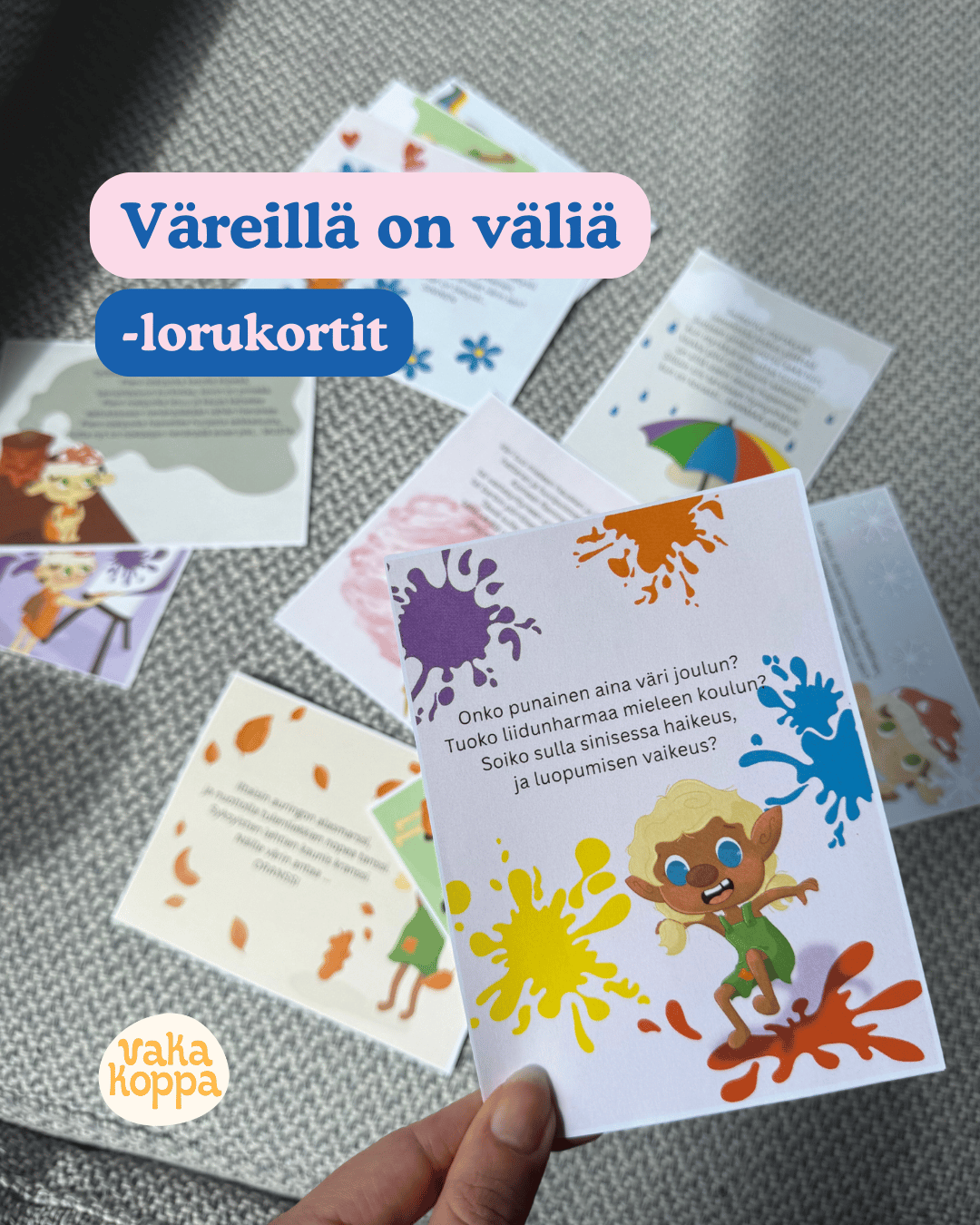 Vakakopan uusissa Väreillä on väliä -lorukorteissa arvuutellaan yhdessä Puro-Peikon ja Kaarna-Keijun kanssa värejä ja väreihin liittyviä asioita perinteisesti loppuriimeillä riimitellen.